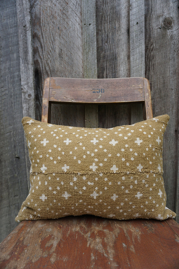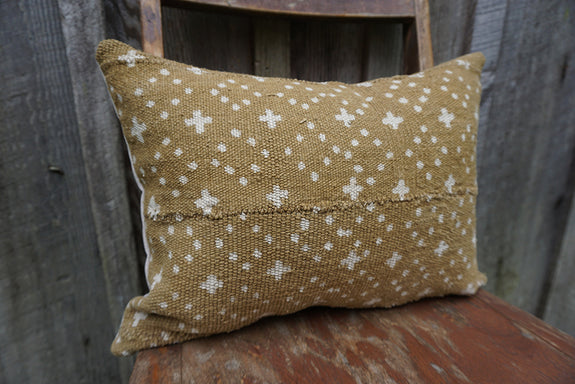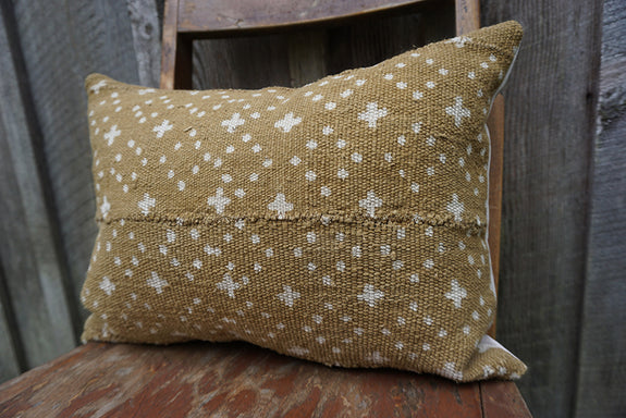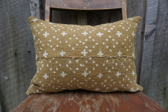 The front of this pillow is made from handwoven and hand dyed mudcloth from Mali. This form of textile is traditionally woven by men; the cotton cloth is then sewn together in strips and dyed with fermented mud. No two pieces of mudcloth are exactly the same, which makes each piece unique! The backing is a natural-coloured cotton/poly twill and has an envelope enclosure.